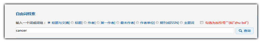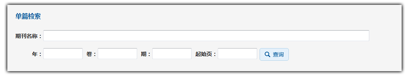 2.在自由词检索下设有单篇检索框,如果您要查找某单篇文献,请在此检索,依次输入期刊名称、年份、卷期、起始页提交即可检索