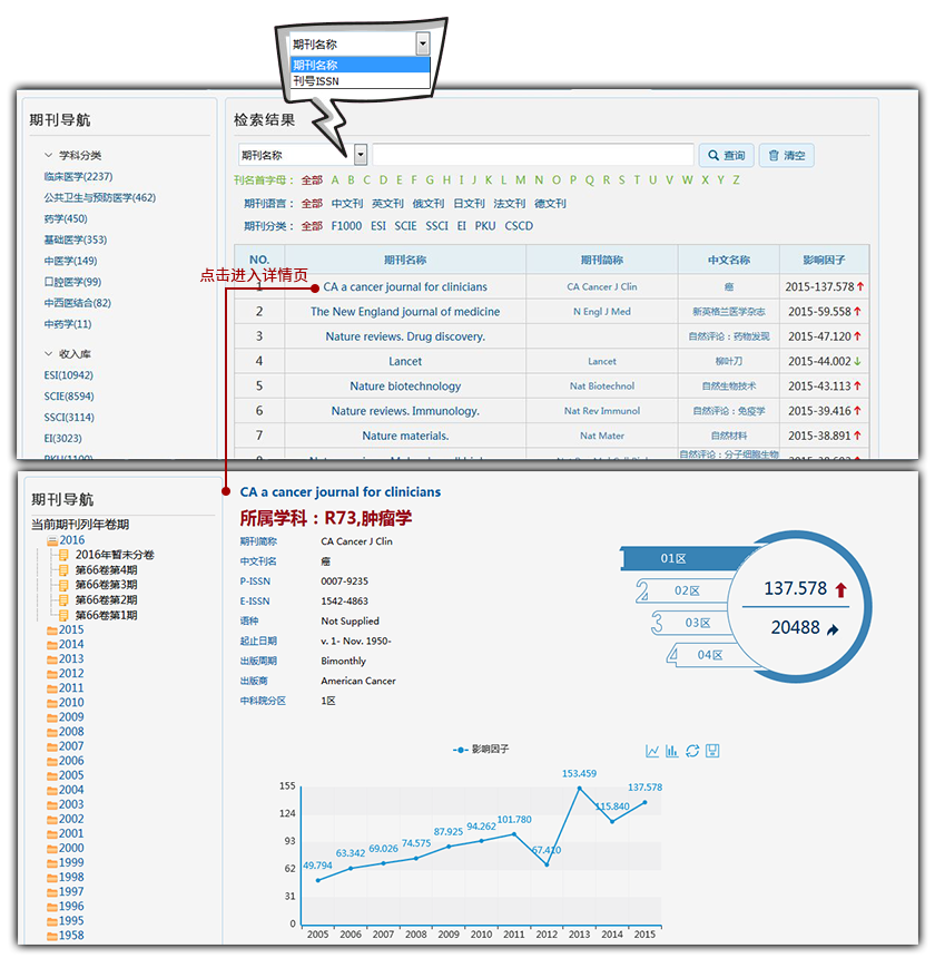 1.左侧按学科列出各学科的分类导航,点击学科下的分类名称即可在右边查看该类的期刊列表