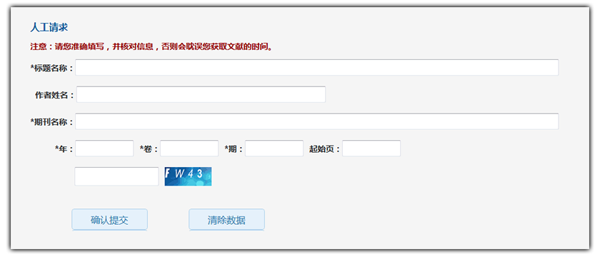 当您已知一些文献书目信息(比如杂志名、卷、期、页码、作者名等)想要获取某一篇文献时,可以采用人工请求功能